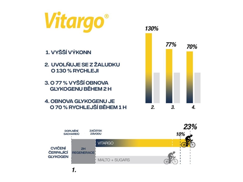 Vitargo je patentovaný sacharidový doplněk dodávající energii pro svaly. Skládá se z objemných sacharidových molekul, které jsou svojí strukturou podobné svalovému glykogenu. Díky tomu se vstřebává velmi rychle a rychle dodává svalům palivo. Přidané ionty (elektrolyty) zlepšují hydrataci a práci svalů při vysokém - vytrvalostním i silovém výkonu.