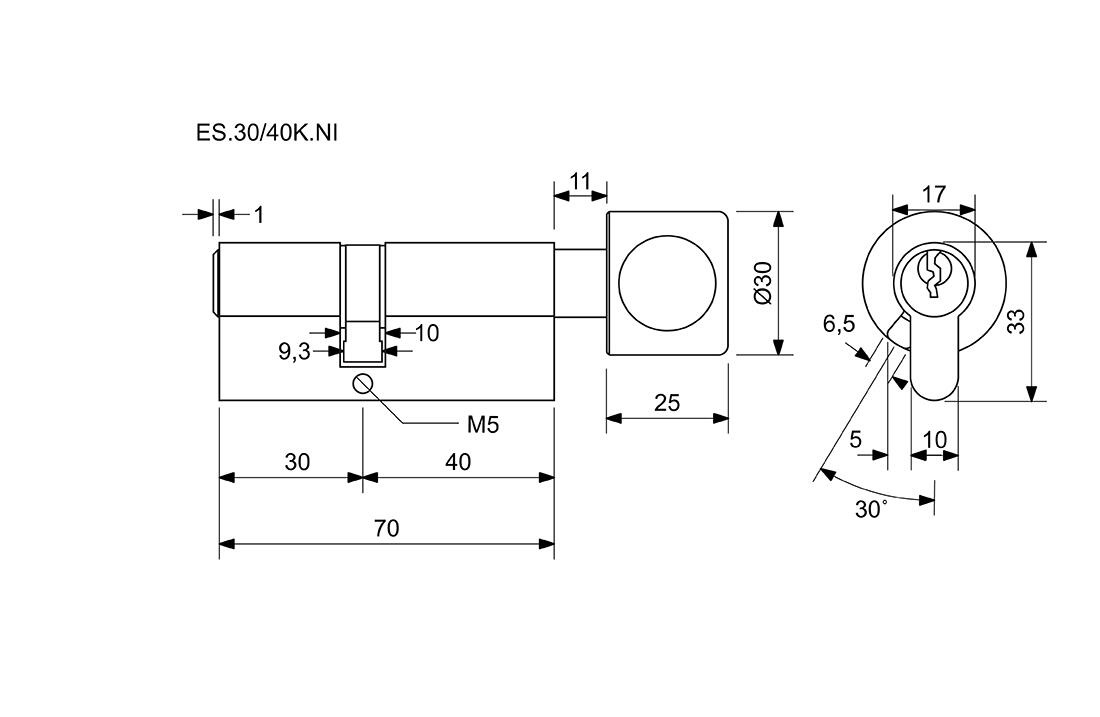 vložka cylindrická 30+40K s knoflíkem na delší str.6kl. Ni, 3.třída bezp.RICHTER