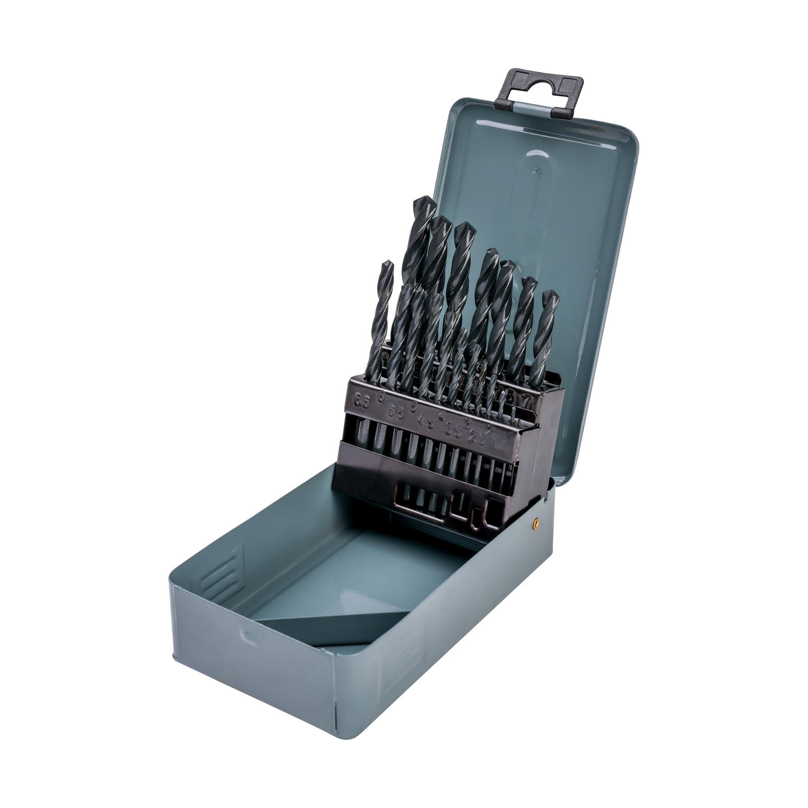 Všechny vrtáky v praktické kovové krabičce.