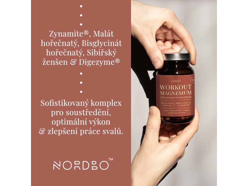 Nordbo Workout Magnesium obsahuje ve dvou kapslích: 120 mg hořčíku, 250 mg ženšenu, 150 extraktu Zynamite® (z toho mangiferinu 22,5 mg), 150 mg enzymů Digezyme®.