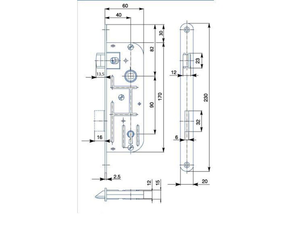Zadlabací dozický zámek 02-03 jednozápadový bez převodu s otvory pro dělené štíty je univerzální na pravé i levé dveře.