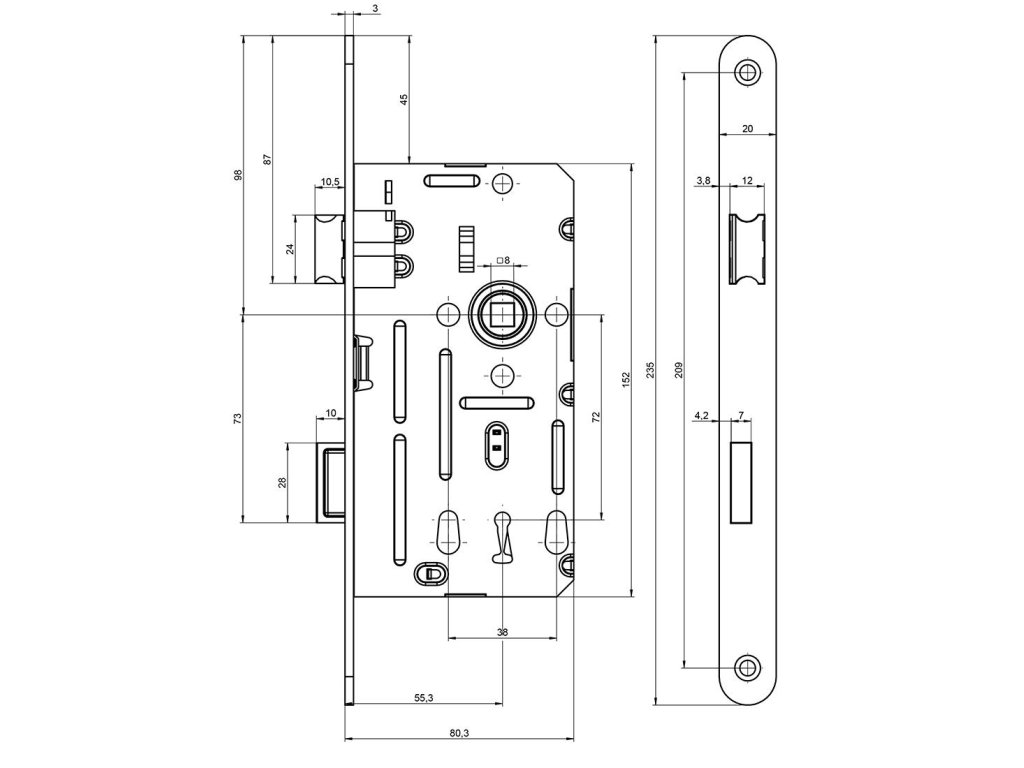 - rozteč 72 mm, zádlab 80 mm, backset 55 mm, šířka čela 20 mm