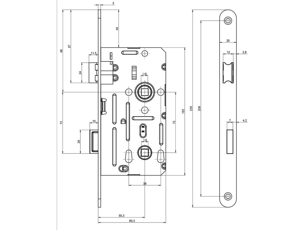 - rozteč 72 mm, zádlab 80 mm, backset 55 mm, šířka čela 20 mm