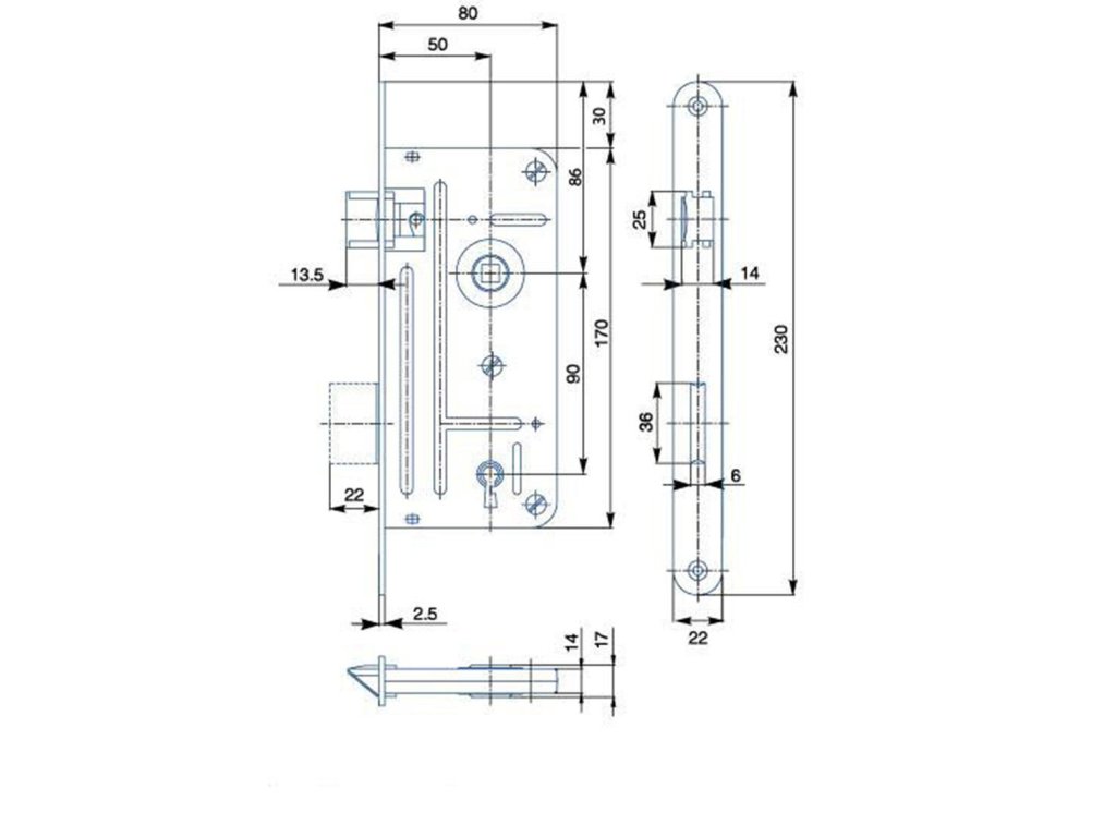 Zadlabací dozický zámek 548A dvouzápadový s převodem bez otvory pro dělené štíty je univerzální na pravé i levé dveře.