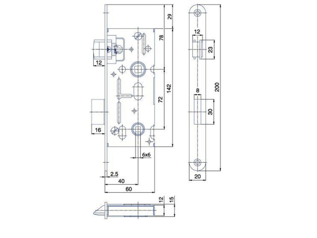 Zadlabací zámek K111 WC s ořechem jednozápadový bez převodu a s otvory pro dělené štíty je univerzální na pravé i levé dveře a je určen do dveří, které nemají zvýšený nárok na bezpečnost.