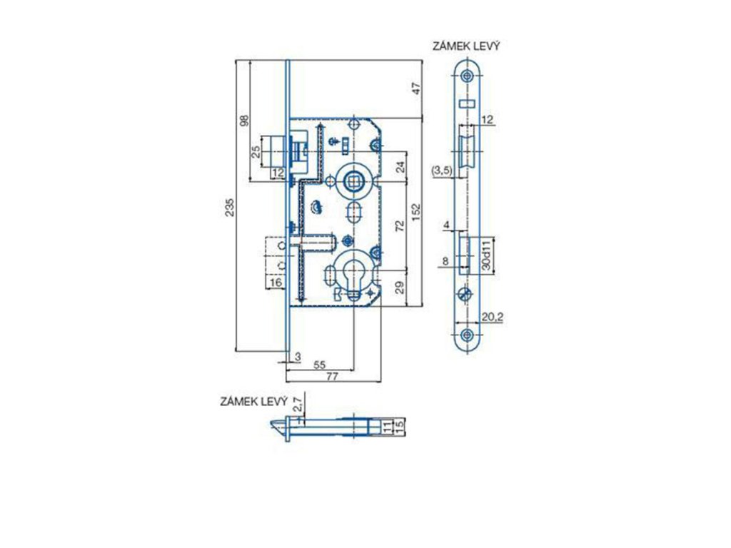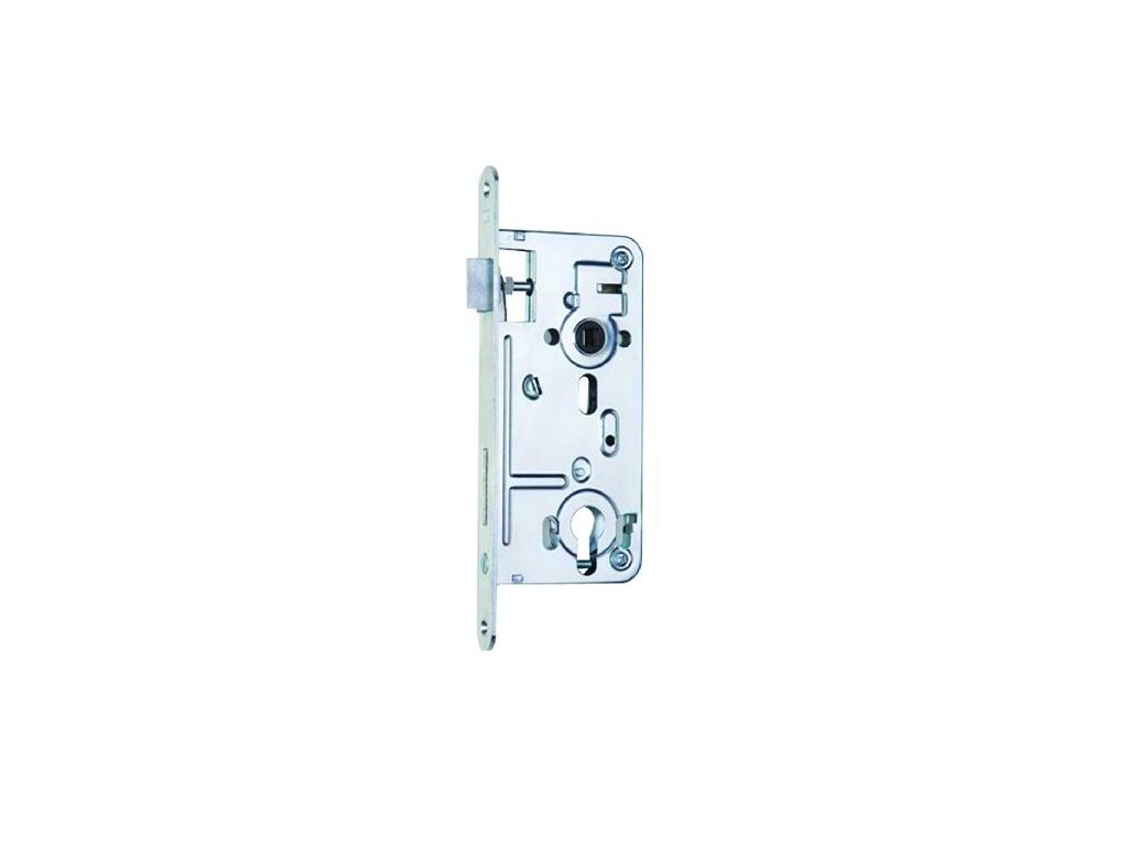 Zadlabací zámek (levý) určený pro cylindrickou vložku je jednozápadový, s převodem (střelka ovládaná klikou i klíčem) a s otvory pro dělené štítky.