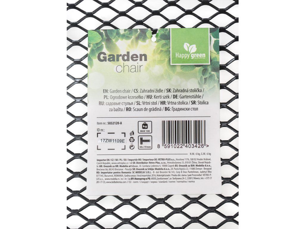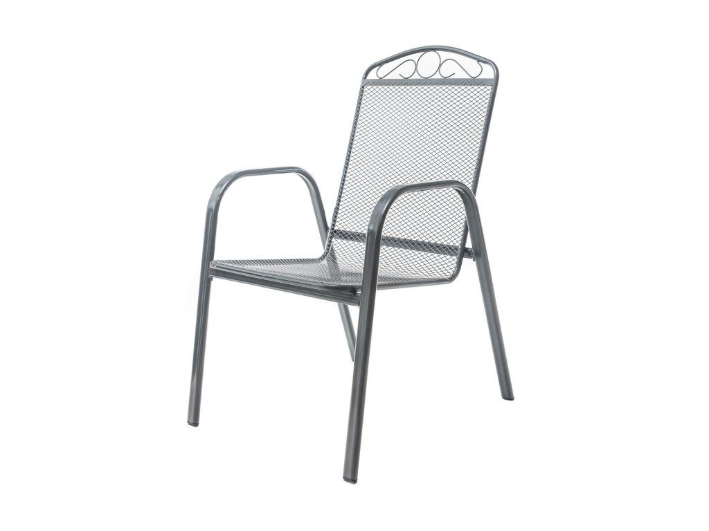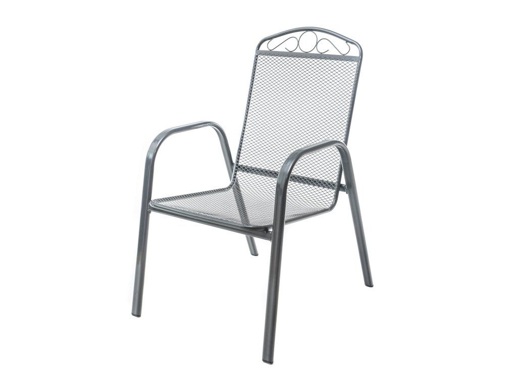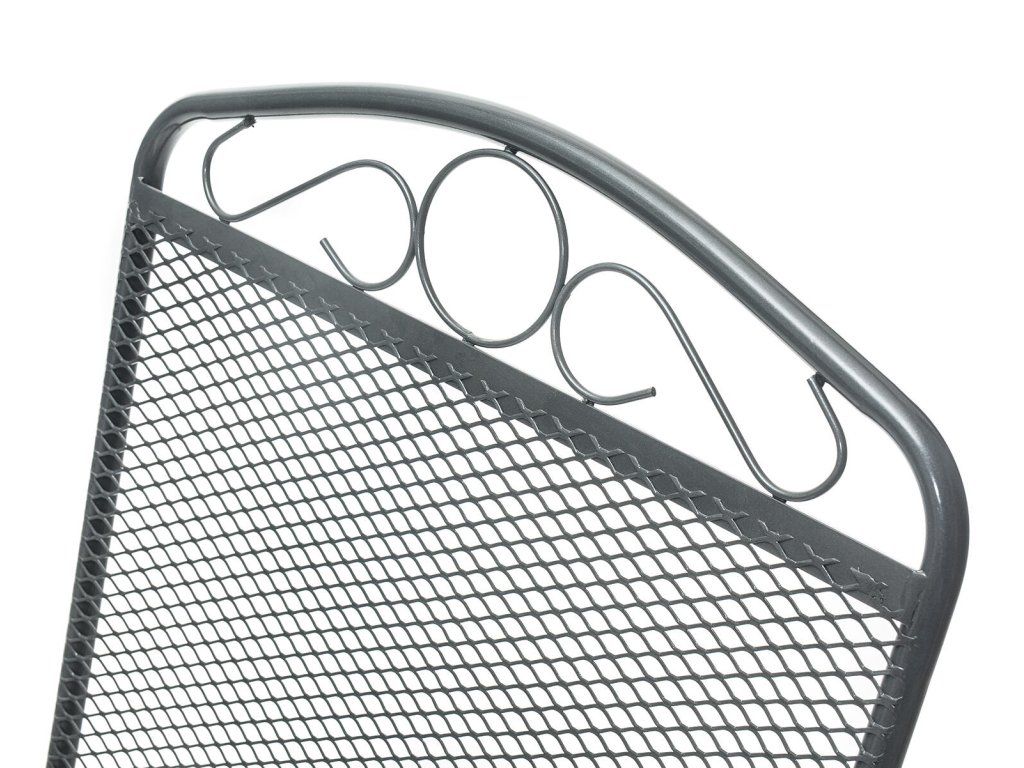 Ocelová zahradní židle s opěrkou, zakončenou vkusným dekorem, se hodí zejména do zahrad a na terasy domů.